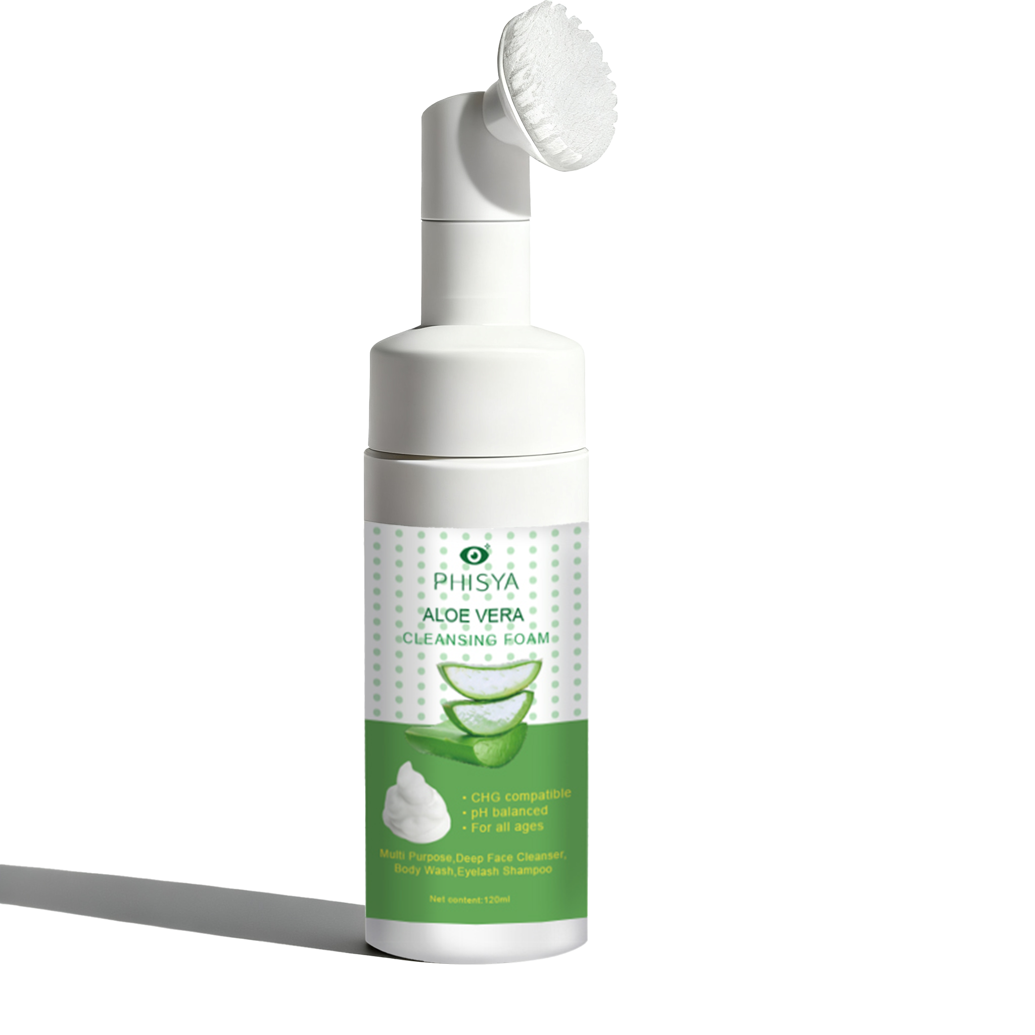 PHISYA Aloe Vera Cleansing Foam features a gentle, pH-balanced formula enriched with aloe vera, centella asiatica, and chrysanthellum indicum. This cleansing foam effectively cleanses pores, removes excess oil and impurities, and soothes the skin. The dense foam, combined with a built-in soft brush applicator, ensures a deeper yet gentle cleanse suitable for all skin types and ages.